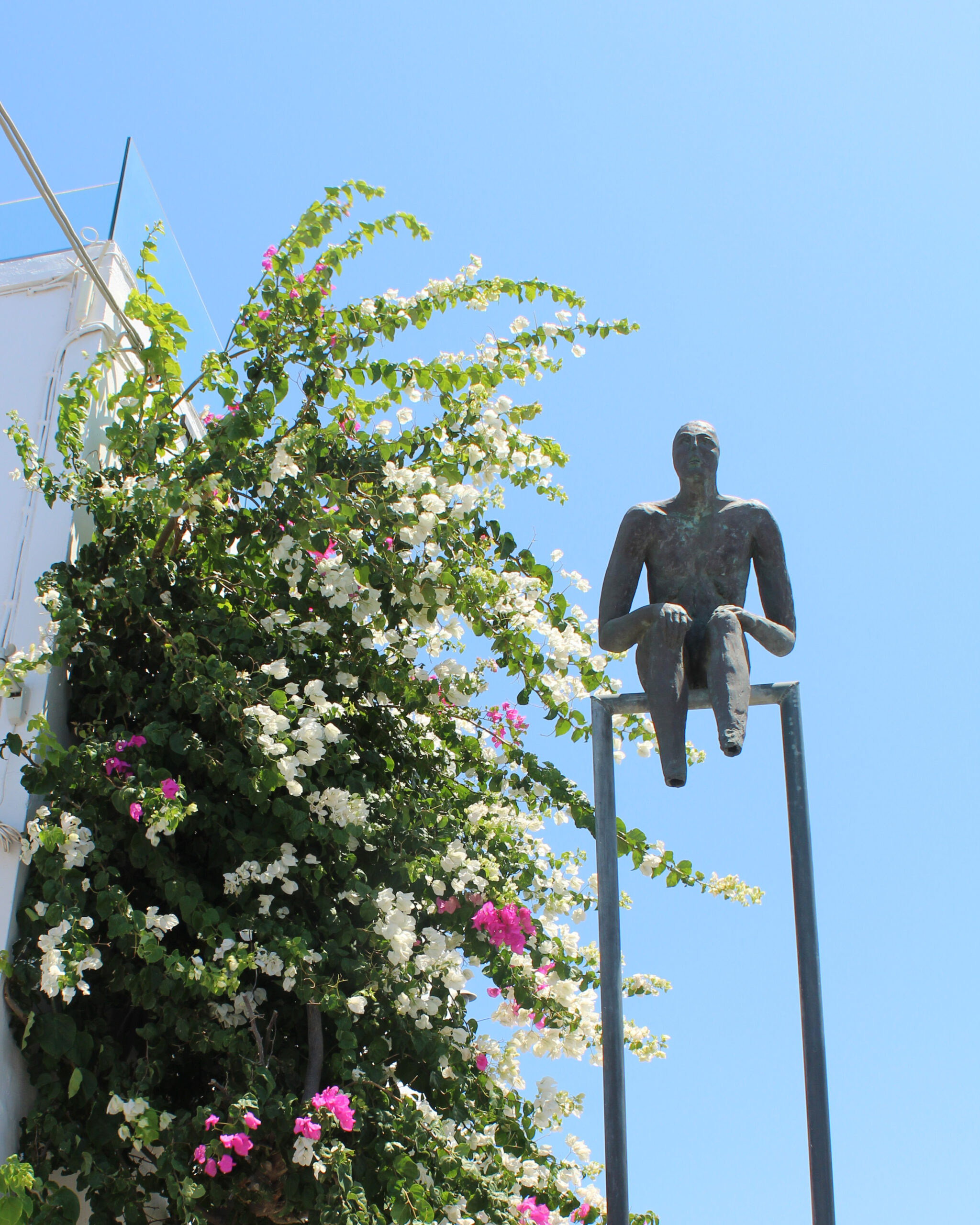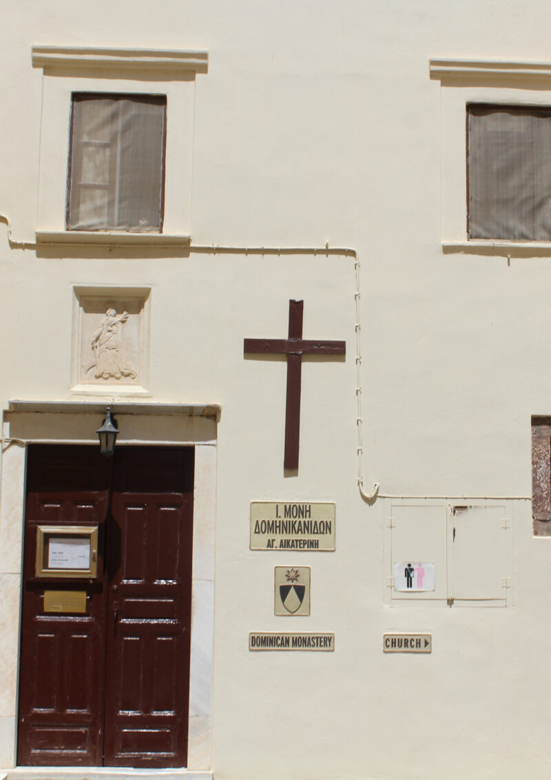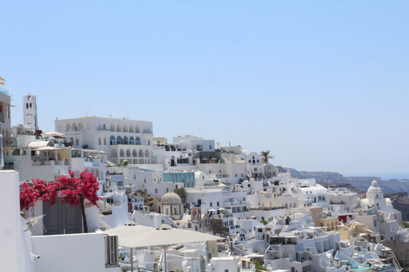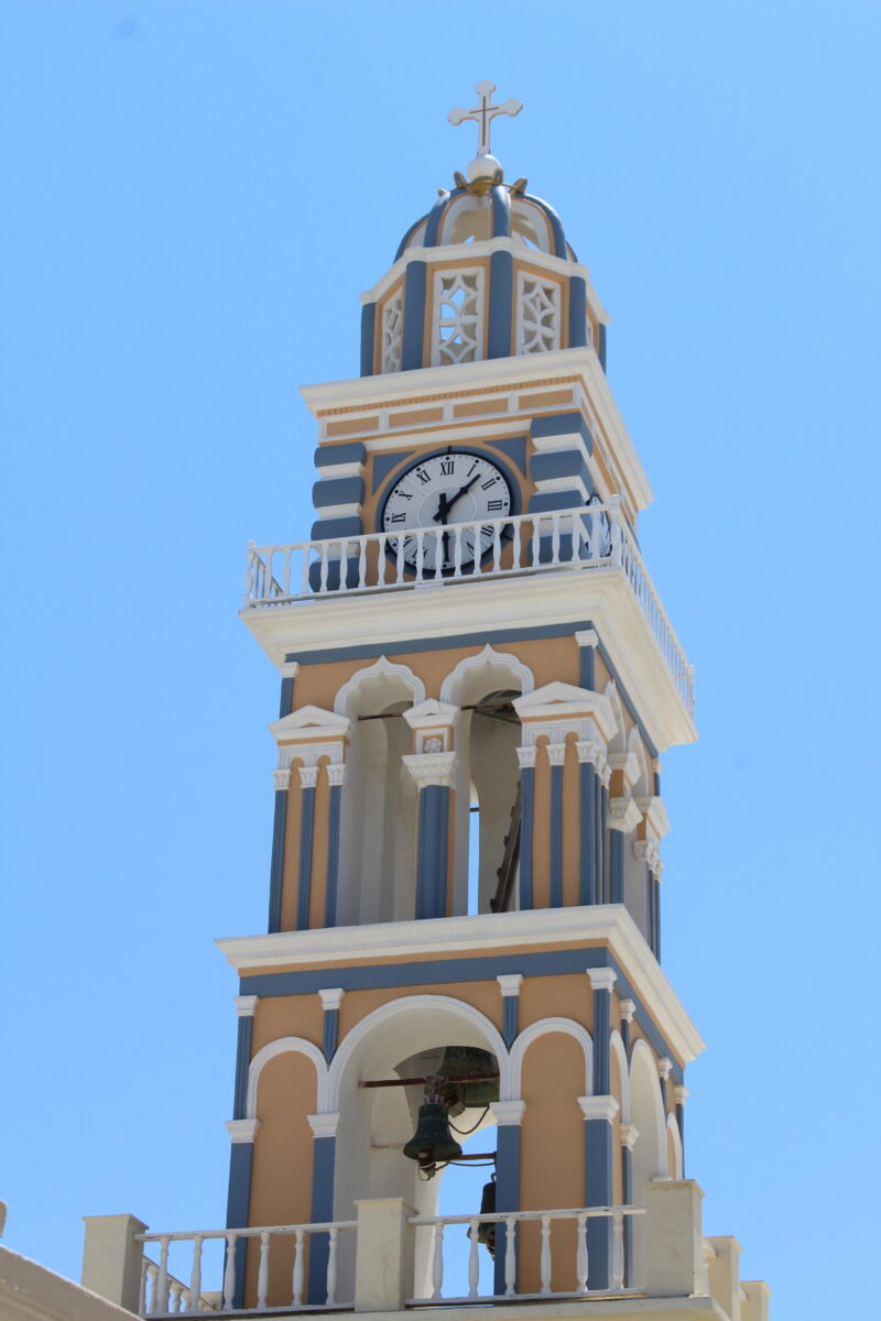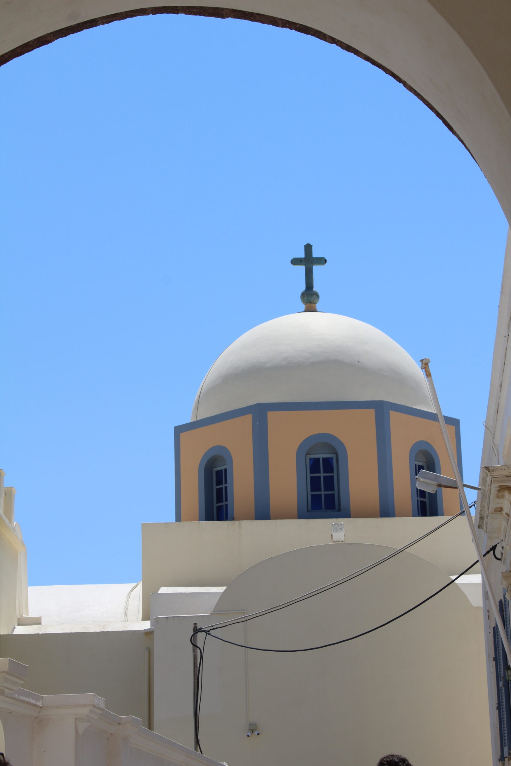 I took this photo facing forward, I liked how you could see it from the curved archway. A huge part of Greece is how it can take ugly things, such as buildings and pathways into beautiful items to look at, which is why I like the cables running through. The colours worked well together, blue, yellow and white were the primary colours in Fira, and a lot of Greek Orthodox buildings.